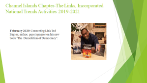 In 2020, Link Michele R. Dean, Ed.D., presented a 90-minute after school “Contemporary Black Ballerinas” professional development session with three fifth grade teachers at Juan Lagunas Soria Elementary School in the Oxnard School District in Ventura County, California. In addition to Link Dean, Link Debra Bagley, Link Charlotte Gullap-Moore, and Link Doris Wells were in also attendance. The program grew to 19 teachers & Links members in 2021 via Zoom professional development sessions, including books on Paul Robeson, Josephine Baker and other notables. The 2022 program garnered 30 teaching professionals & Link members with books showcasing Melba Liston, Celia Cruz, Philip Freelon and other famous personalities. These books are read & vetted by Link Members to introduce to Ventura County middle school educators to share with their students, particularly in Black History month.